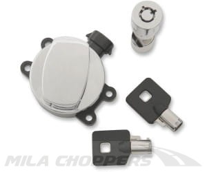 Chromowana stacyjka na okrągły kluczyk + blokada główki ramy do motocykli Harley Davidson.