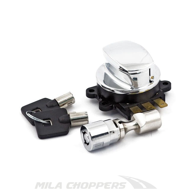 Chromowana stacyjka na okrągły kluczy + blokada główki ramy do motocykli Harley Davidson.